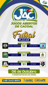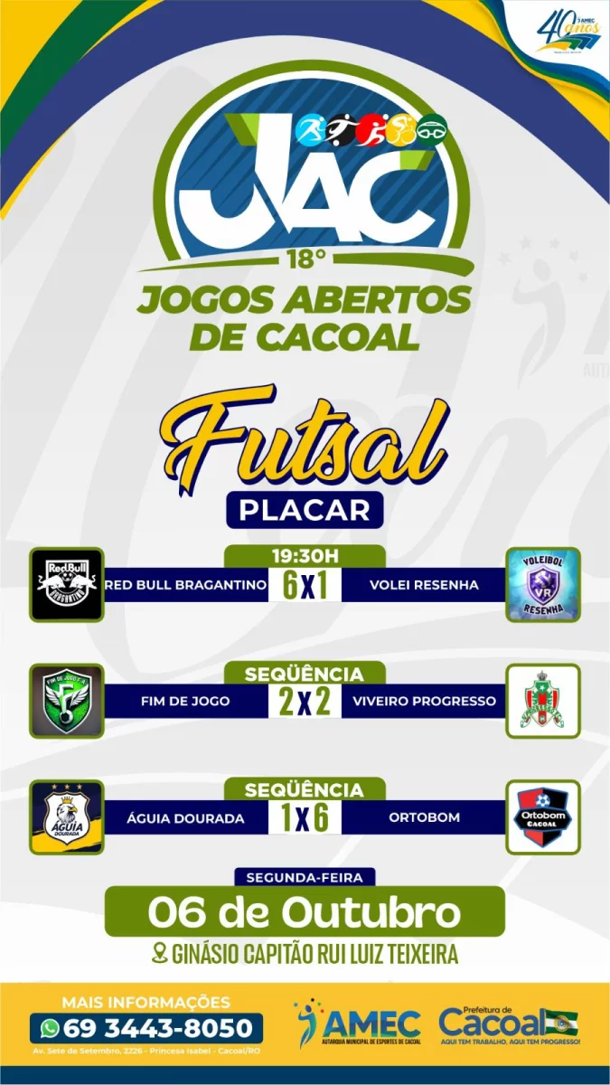 O Ginásio Capitão Rui Luiz Teixeira foi o palco de grandes emoções na noite desta segunda-feira, com a realização de três partidas de futsal válidas pelos 18º Jogos Abertos de Cacoal (JAC). O público compareceu e assistiu a uma rodada com muitos gols e disputas acirradas do início ao fim.